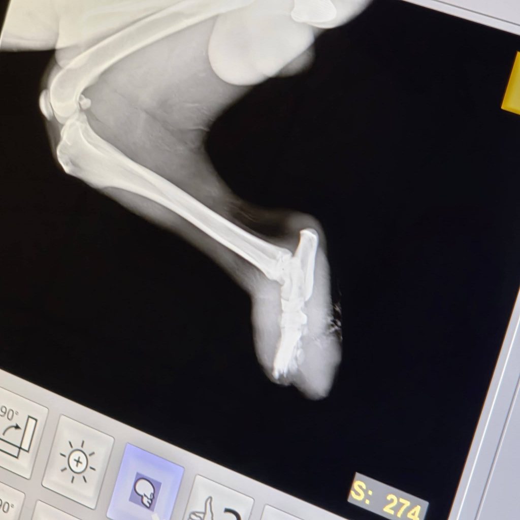 Die Verletzungen an beiden Hinterbeinen sind nicht zur gleichen Zeit entstanden. Es ist leider sehr wahrscheinlich, dass sie absichtlich verursacht wurden – unser Verdacht geht in Richtung einer Drahtschlinge.