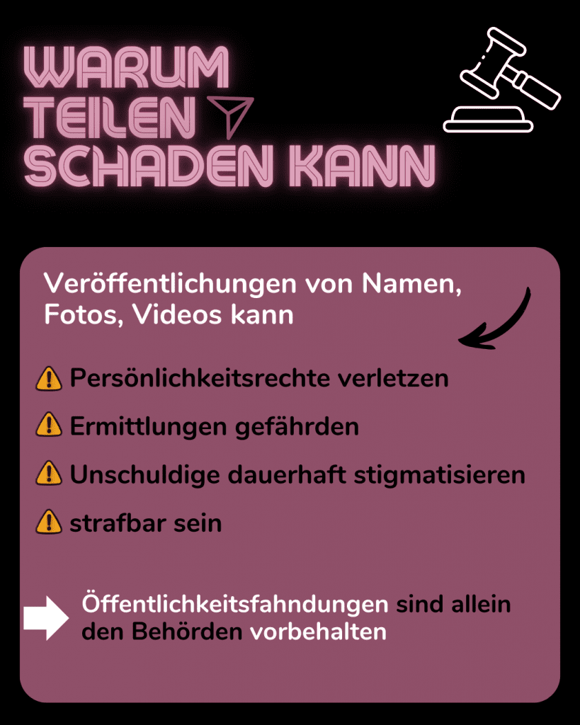 Öffentliches Teilen von Namen, Fotos oder Vermutungen kann strafbar sein und laufende Verfahren gefährden.