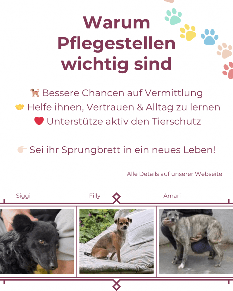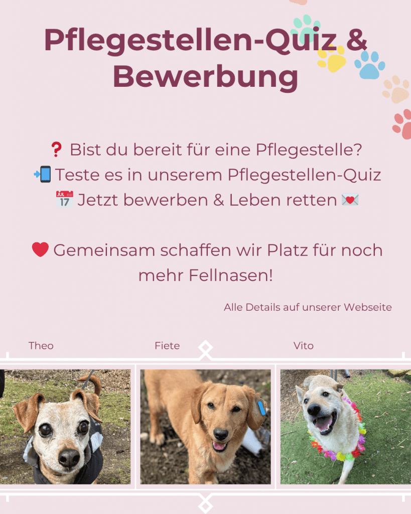 👉 Hunde in Pflege haben bessere Vermittlungschancen und finden schneller ein Für‑immer‑Zuhause – dank deiner Unterstützung! 🐕💫 Alle Infos rund um das Thema findest du in unserem FAQ zum Thema Pflegestelle